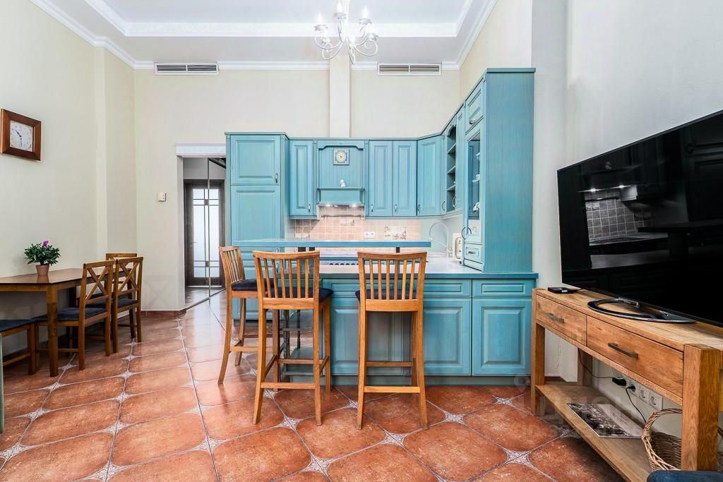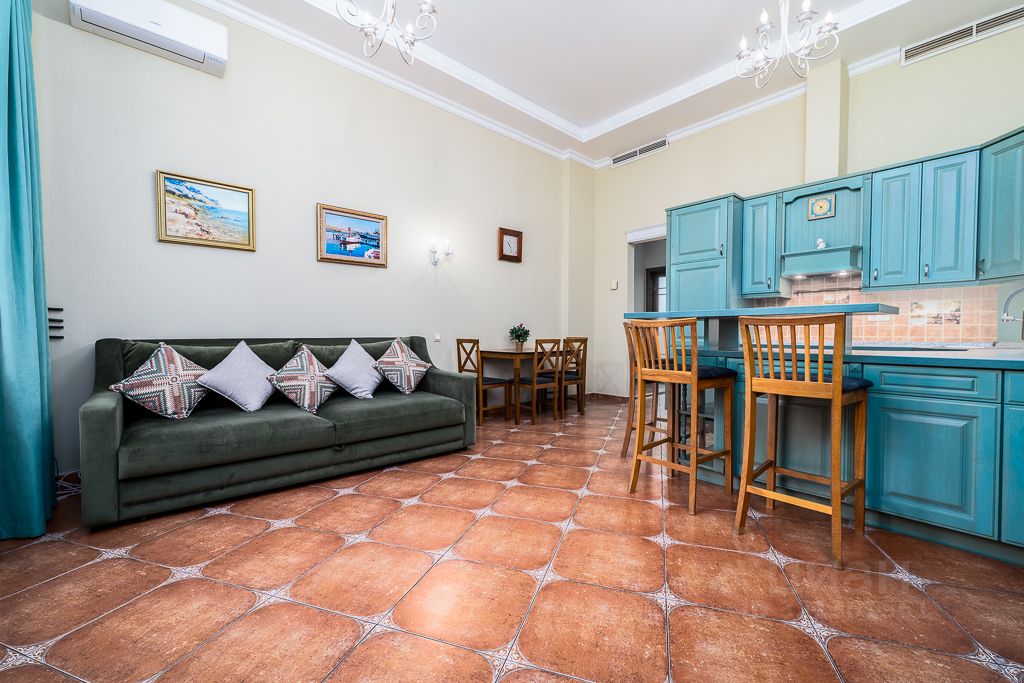 + просторная гостиная совмещенная с кухней столовой с видом на пальмовую аллею