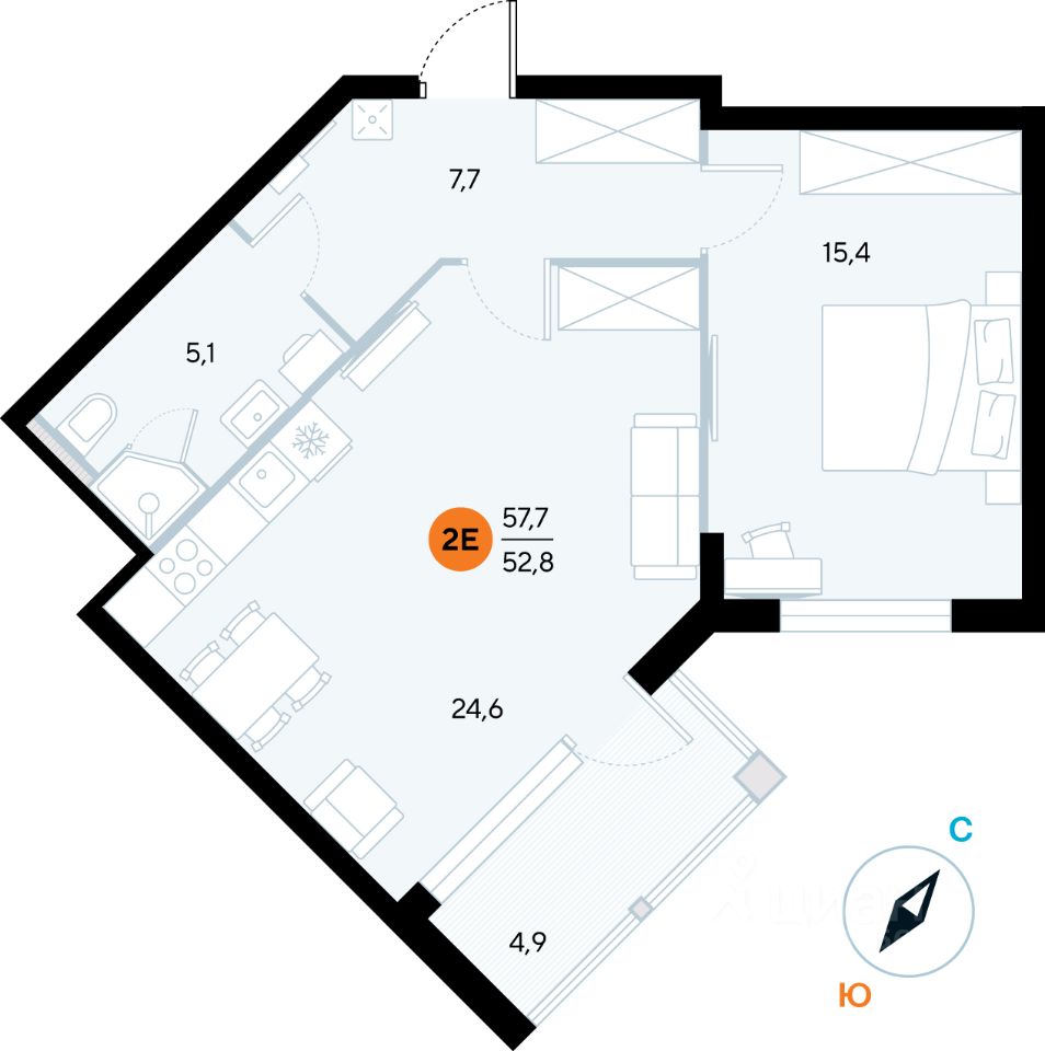 Общая площадь57,4 м²
