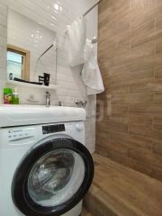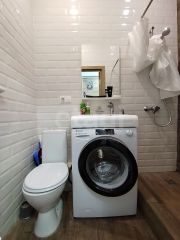 Санузел просто блестит и сверкает, а кухня оборудована стильной мебелью и современной техникой.