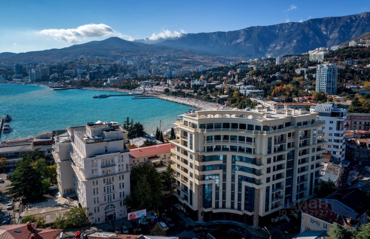 5-й этаж современного 9-этажного здания бизнес-класса, общая площадь апартамента 86 кв.м, светлое помещение с высокими потолками и панорамным остеклением, планировка включает просторную кухню-гостиную, уютную спальню, холл, ванную комнату и террасу с потрясающим видом на Ялтинскую бухту, море и побережье от Ласточкиного гнезда, холма Магоби и горы Ай-Петри, до шикарной панорамы города.