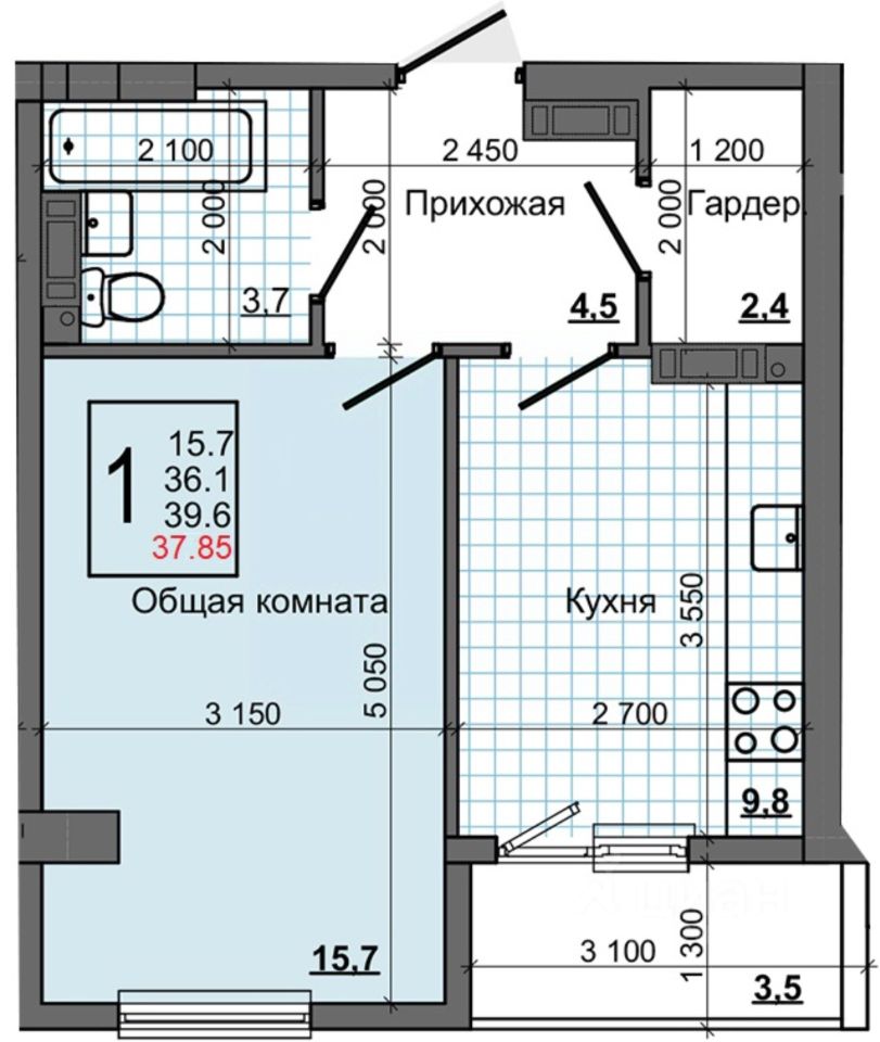 • Кухня: 9,8 м² с выходом на лоджию 3,5 м²