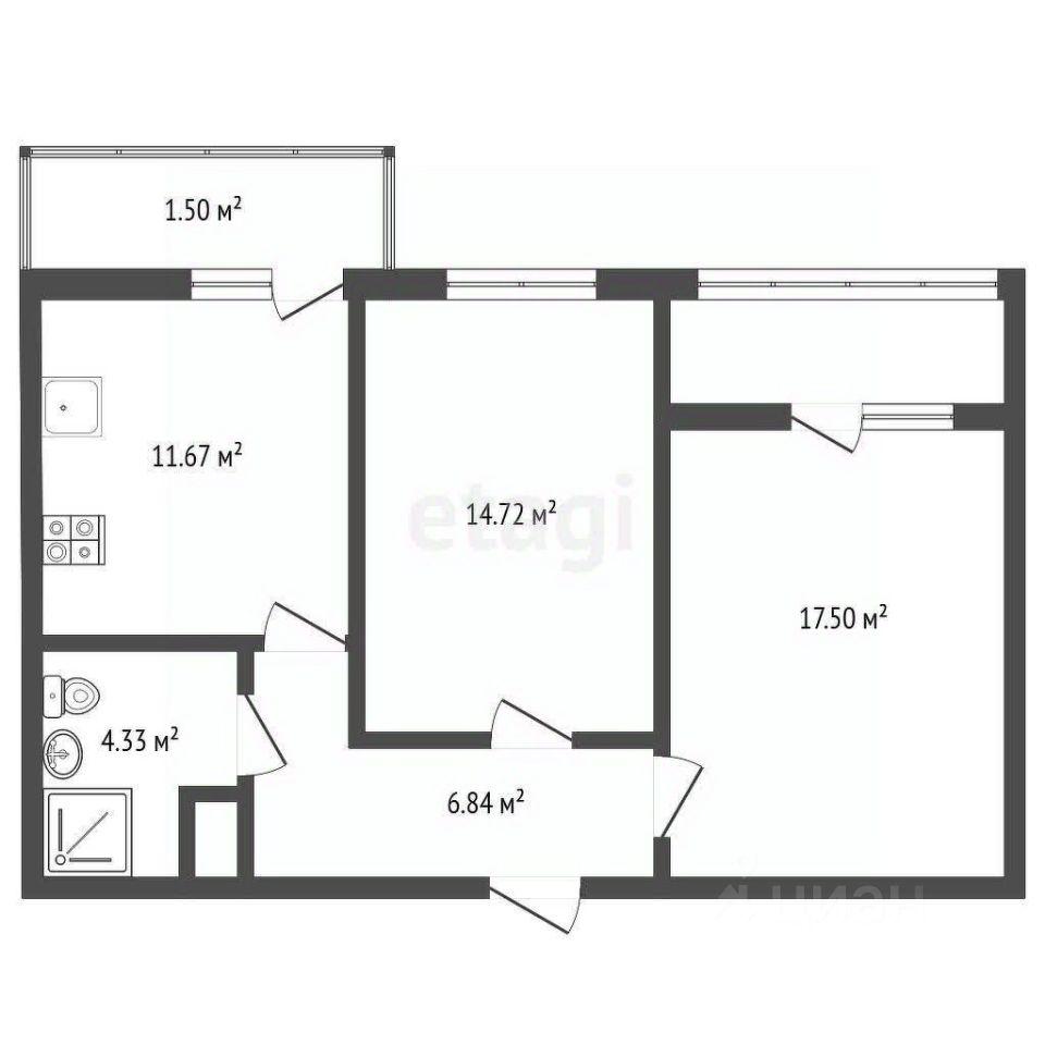 Общая площадь 55 кв. м, застекленный балкон и лоджия, совмещенный санузел.