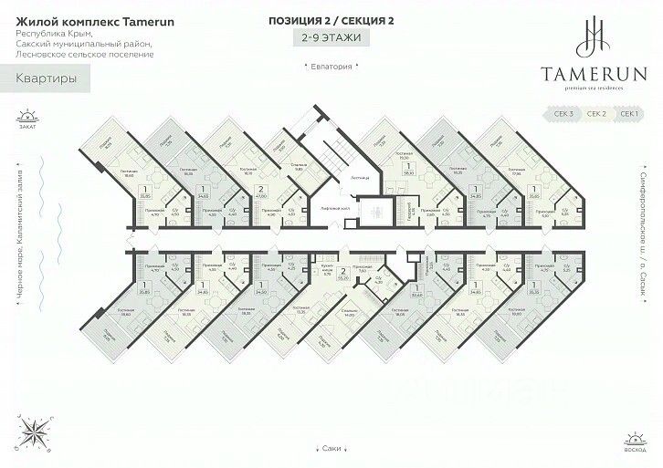 Резиденция "Tamerun" представляет собой современный комплекс из четырёх корпусов высотой 9 и 12 этажей, гармонично вписанных в живописный ландшафт. Интерьеры выполнены в изысканном элегантном стиле с применением премиальных материалов — натурального мрамора, ценных пород дерева и высококачественной кожи. Просторные помещения наполнены естественным светом благодаря большим панорамным окнам, открывающим завораживающие виды на Черное море. Атмосфера резиденции пропитана уютом и гармонией, создавая идеальные условия для комфортной жизни и отдыха.