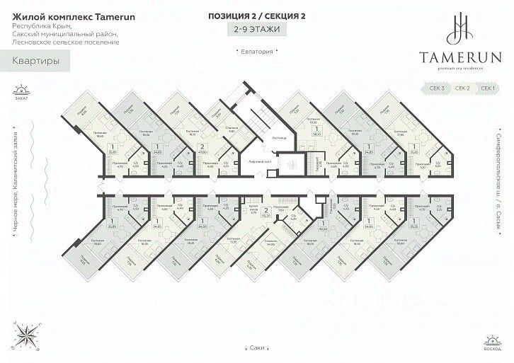 "Tamerun" - морская резиденция на Западном берегу Крыма, между городами Евпатория и Саки. Резиденция "Tamerun" представляет собой современный комплекс из четырёх корпусов высотой 9 и 12 этажей, гармонично вписанных в живописный ландшафт. Интерьеры выполнены в изысканном элегантном стиле с применением премиальных материалов — натурального мрамора, ценных пород дерева и высококачественной кожи. Просторные помещения наполнены естественным светом благодаря большим панорамным окнам, открывающим завораживающие виды на Черное море. Атмосфера резиденции пропитана уютом и гармонией, создавая идеальные условия для комфортной жизни и отдыха. Рядом с "Tamerun" находится Сасыкский заказник и самое крупное в Крыму солёное розовое озеро Сасык-Сиваш. На территории резиденции находится открытый бассейн с подогревом, окружённый шезлонгами и зоной отдыха, где можно наслаждаться теплыми лучами солнца и свежим морским бризом. Для любителей активного отдыха предусмотрен теннисный корт и фитнес-зал, оборудованный новейшими тренажёрами. В солнечной резиденции есть всё для жизни и интересного отдыха: собственный песчаный пляж и теннисный корт, бассейны с морской водой, рестораны и летнее кафе, зона СПА и фитнес-центр, общественно-деловые пространства и подземный паркинг. Профессиональная сервисная компания с международным опытом возьмёт на себя все операционные вопросы по управлению и эксплуатации, обеспечивая 5-звёздочный уровень обслуживания.