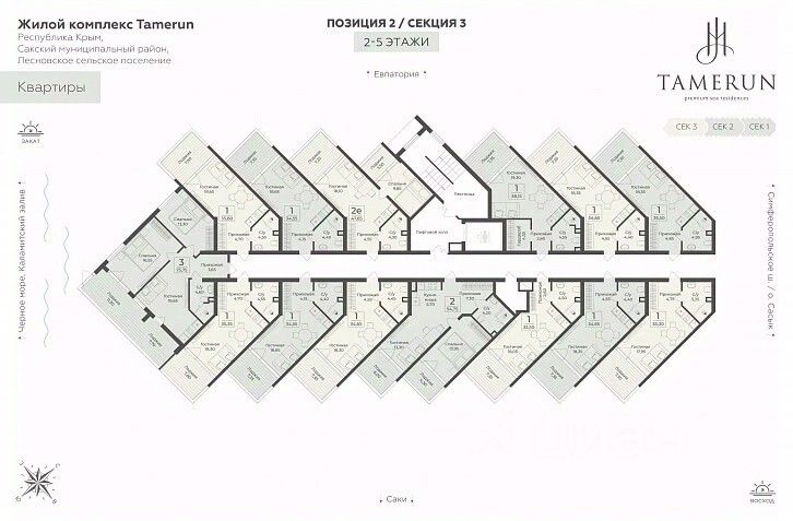 "Tamerun" - морская резиденция на Западном берегу Крыма, между городами Евпатория и Саки. Резиденция "Tamerun" представляет собой современный комплекс из четырёх корпусов высотой 9 и 12 этажей, гармонично вписанных в живописный ландшафт. Интерьеры выполнены в изысканном элегантном стиле с применением премиальных материалов — натурального мрамора, ценных пород дерева и высококачественной кожи. Просторные помещения наполнены естественным светом благодаря большим панорамным окнам, открывающим завораживающие виды на Черное море. Атмосфера резиденции пропитана уютом и гармонией, создавая идеальные условия для комфортной жизни и отдыха. Рядом с "Tamerun" находится Сасыкский заказник и самое крупное в Крыму солёное розовое озеро Сасык-Сиваш. На территории резиденции находится открытый бассейн с подогревом, окружённый шезлонгами и зоной отдыха, где можно наслаждаться теплыми лучами солнца и свежим морским бризом. Для любителей активного отдыха предусмотрен теннисный корт и фитнес-зал, оборудованный новейшими тренажёрами. В солнечной резиденции есть всё для жизни и интересного отдыха: собственный песчаный пляж и теннисный корт, бассейны с морской водой, рестораны и летнее кафе, зона СПА и фитнес-центр, общественно-деловые пространства и подземный паркинг. Профессиональная сервисная компания с международным опытом возьмёт на себя все операционные вопросы по управлению и эксплуатации, обеспечивая 5-звёздочный уровень обслуживания.