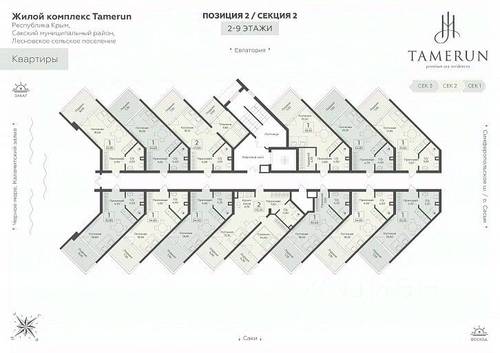 Резиденция "Tamerun" представляет собой современный комплекс из четырёх корпусов высотой 9 и 12 этажей, гармонично вписанных в живописный ландшафт. Интерьеры выполнены в изысканном элегантном стиле с применением премиальных материалов — натурального мрамора, ценных пород дерева и высококачественной кожи. Просторные помещения наполнены естественным светом благодаря большим панорамным окнам, открывающим завораживающие виды на Черное море. Атмосфера резиденции пропитана уютом и гармонией, создавая идеальные условия для комфортной жизни и отдыха.