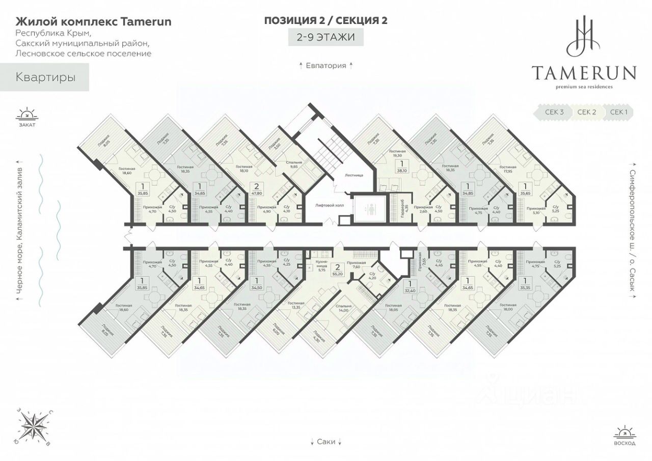 "Tamerun" - морская резиденция на Западном берегу Крыма, между городами Евпатория и Саки. Резиденция "Tamerun" представляет собой современный комплекс из четырёх корпусов высотой 9 и 12 этажей, гармонично вписанных в живописный ландшафт. Интерьеры выполнены в изысканном элегантном стиле с применением премиальных материалов — натурального мрамора, ценных пород дерева и высококачественной кожи. Просторные помещения наполнены естественным светом благодаря большим панорамным окнам, открывающим завораживающие виды на Черное море. Атмосфера резиденции пропитана уютом и гармонией, создавая идеальные условия для комфортной жизни и отдыха. Рядом с "Tamerun" находится Сасыкский заказник и самое крупное в Крыму солёное розовое озеро Сасык-Сиваш. На территории резиденции находится открытый бассейн с подогревом, окружённый шезлонгами и зоной отдыха, где можно наслаждаться теплыми лучами солнца и свежим морским бризом. Для любителей активного отдыха предусмотрен теннисный корт и фитнес-зал, оборудованный новейшими тренажёрами. В солнечной резиденции есть всё для жизни и интересного отдыха: собственный песчаный пляж и теннисный корт, бассейны с морской водой, рестораны и летнее кафе, зона СПА и фитнес-центр, общественно-деловые пространства и подземный паркинг. Профессиональная сервисная компания с международным опытом возьмёт на себя все операционные вопросы по управлению и эксплуатации, обеспечивая 5-звёздочный уровень обслуживания.