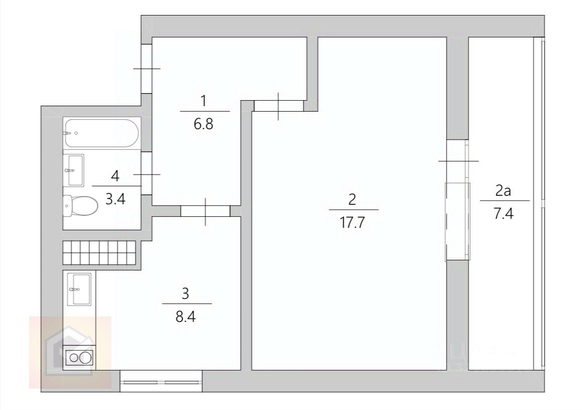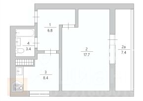 Общая площадь — 36,4 м² + 7,4 м² просторная лоджия, кухня — 8,4 м².