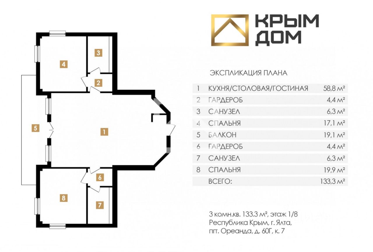 Апартаменты (133,3 м²) расположены на 1 этаже 8-этажного здания. Ключевыми преимуществами являются полная готовность к проживанию, продуманная планировка, уровень комплекса и наличие большой видовой террасы.