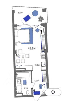 Общая площадь — 42 кв.м. Продуманная планировка: просторная студия или однокомнатный формат с зонированием под кухню, гостиную и спальное место. Санузел современный, вместительный, с местом под стиральную машину. Потолки 3 метра и большие окна создают ощущение лёгкости и наполняют интерьер светом.