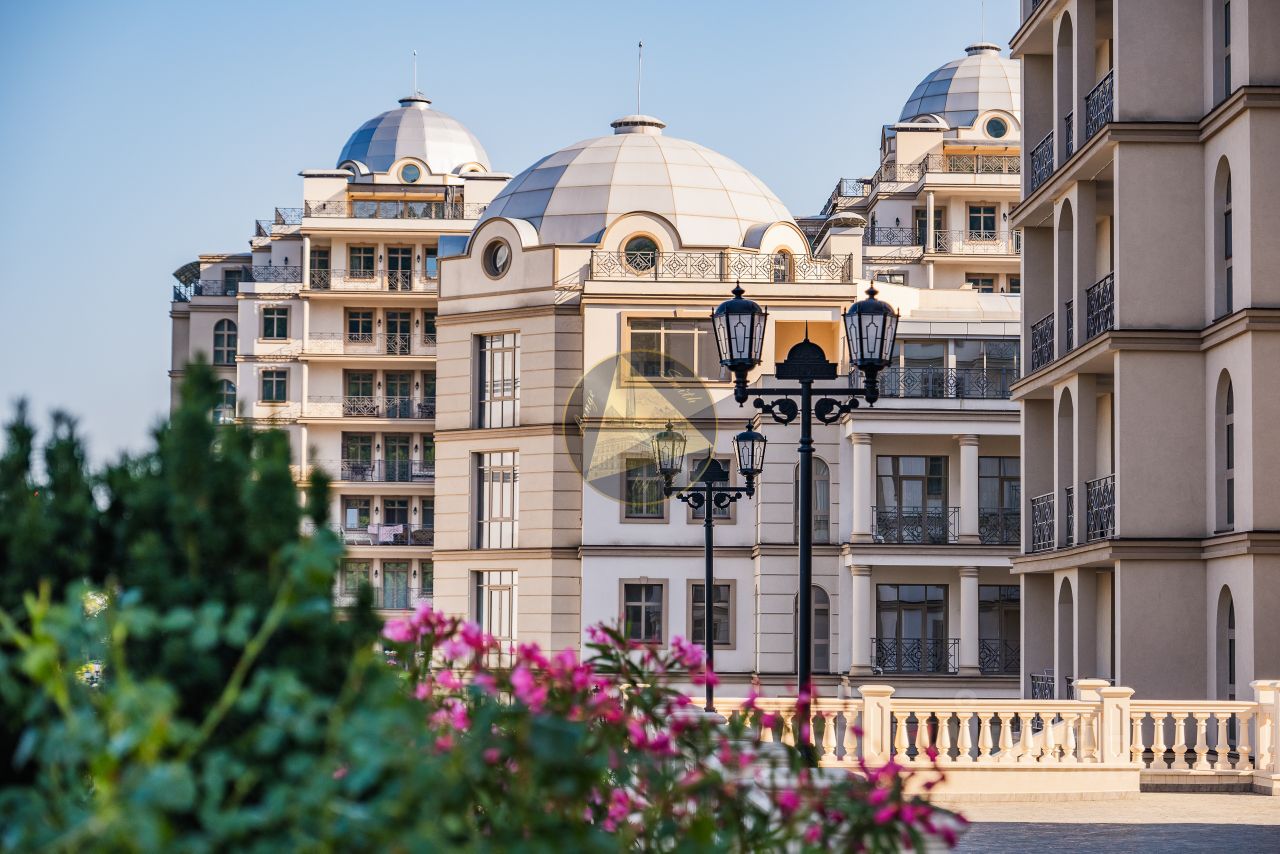 - Для жителей комплекса обустроены детские и спортивные площадки, ресторан, спа-центр и тренажерный зал.