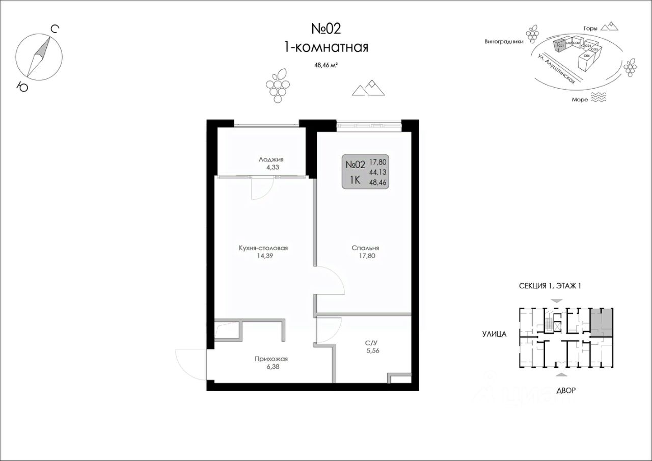 Продаётся 1-комнатная квартира в строящемся доме (Строение 1), срок сдачи: I-кв. 2027, общей площадью 48.46 кв.м., на 1 этаже.