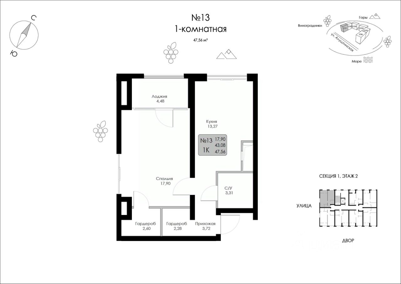 Продаётся 1-комнатная квартира в строящемся доме (Строение 1), срок сдачи: I-кв. 2027, общей площадью 47.56 кв.м., на 2 этаже.