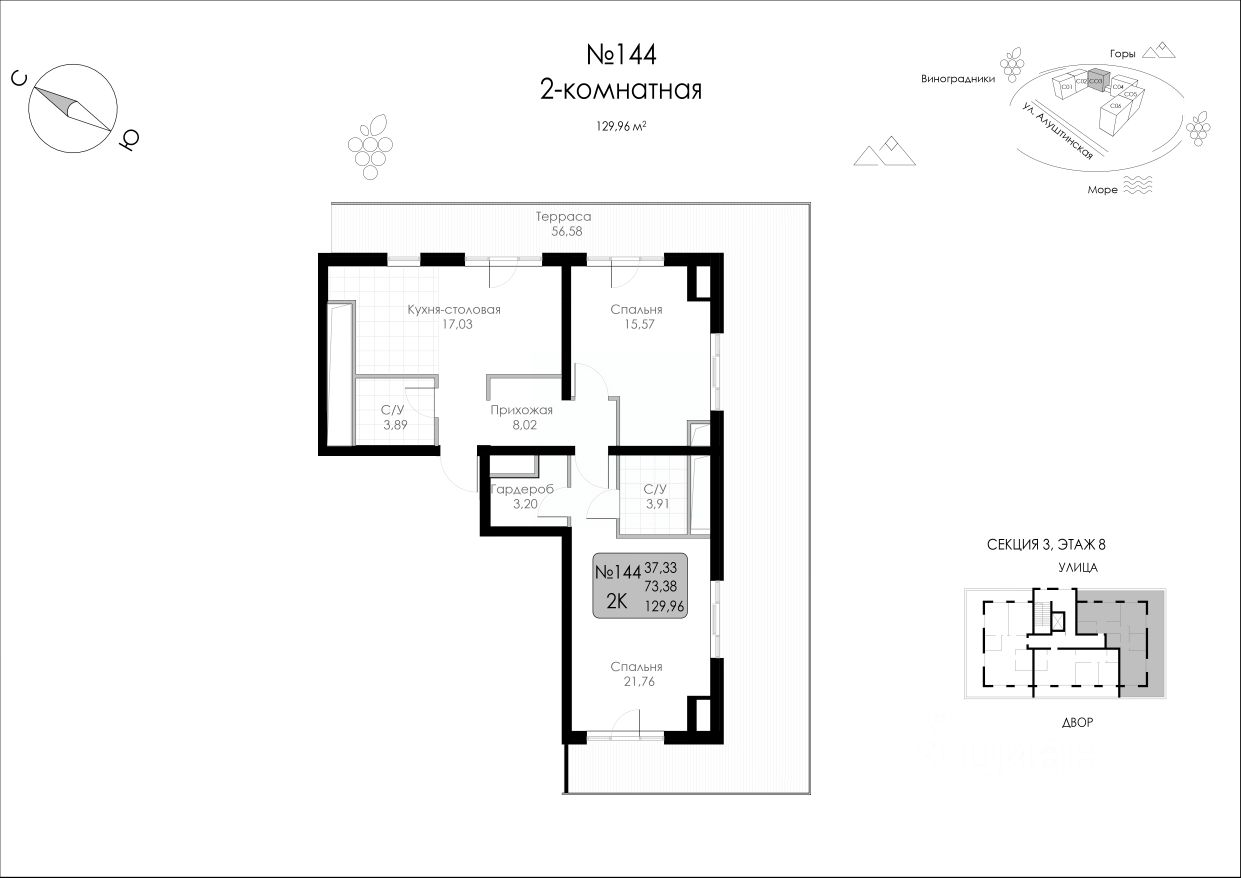 Продаётся 2-комнатная квартира в строящемся доме (Строение 1), срок сдачи: I-кв. 2027, общей площадью 129.96 кв.м., на 8 этаже.