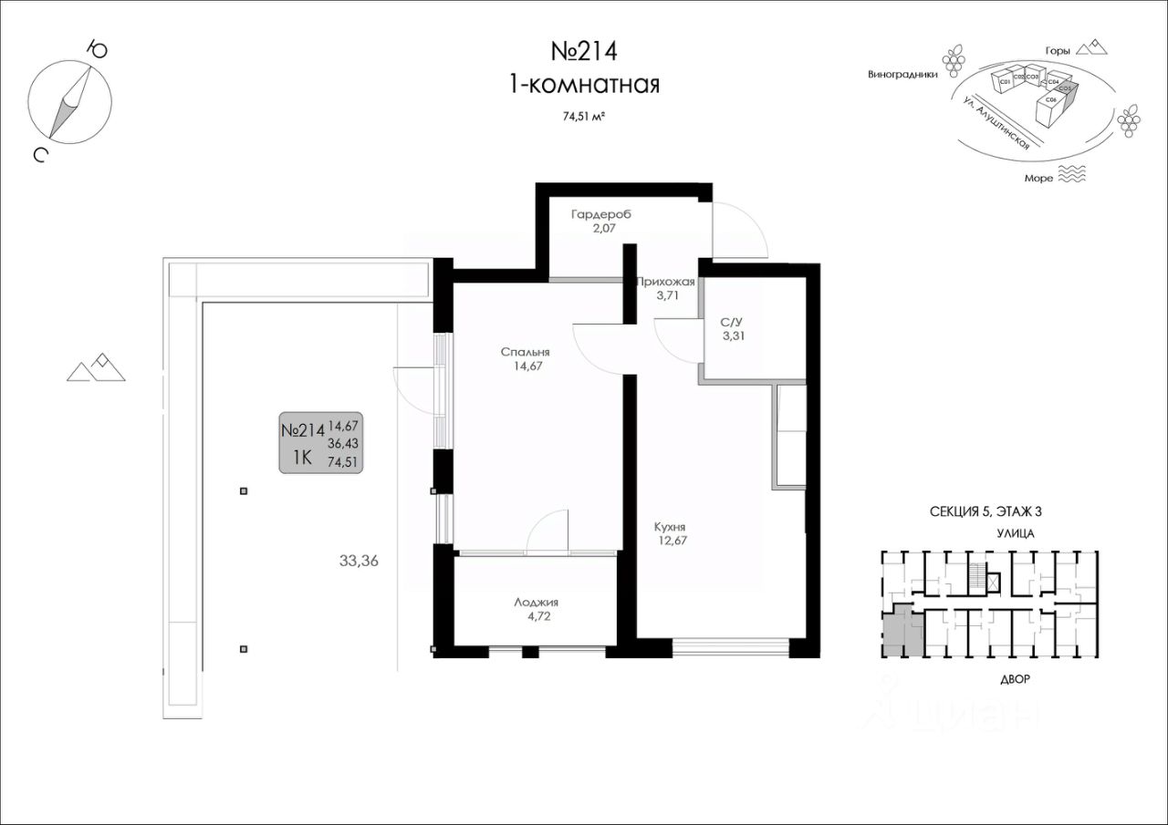 Продаётся 1-комнатная квартира в строящемся доме (Строение 1), срок сдачи: I-кв. 2027, общей площадью 74.51 кв.м., на 3 этаже.