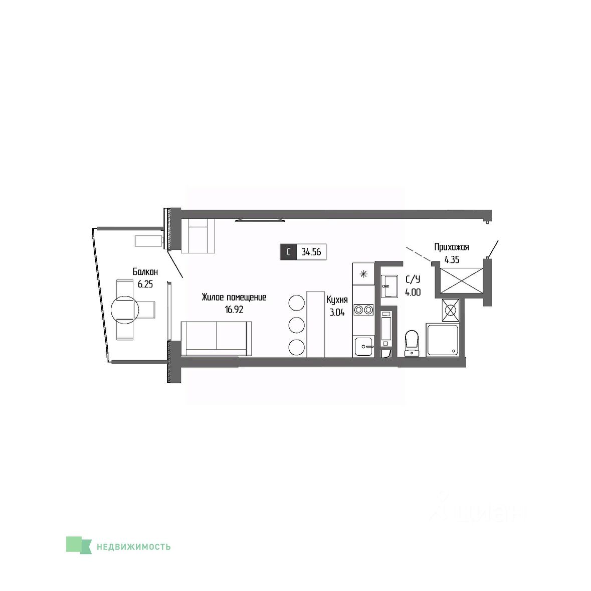 Общая площадь34,56 м²