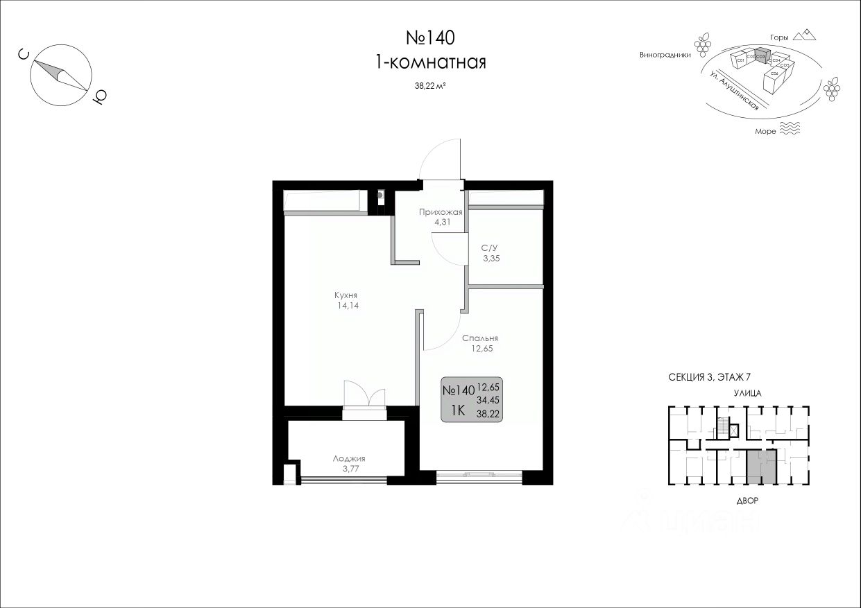 Продаётся 1-комнатная квартира в строящемся доме (Строение 1), срок сдачи: I-кв. 2027, общей площадью 38.22 кв.м., на 7 этаже.