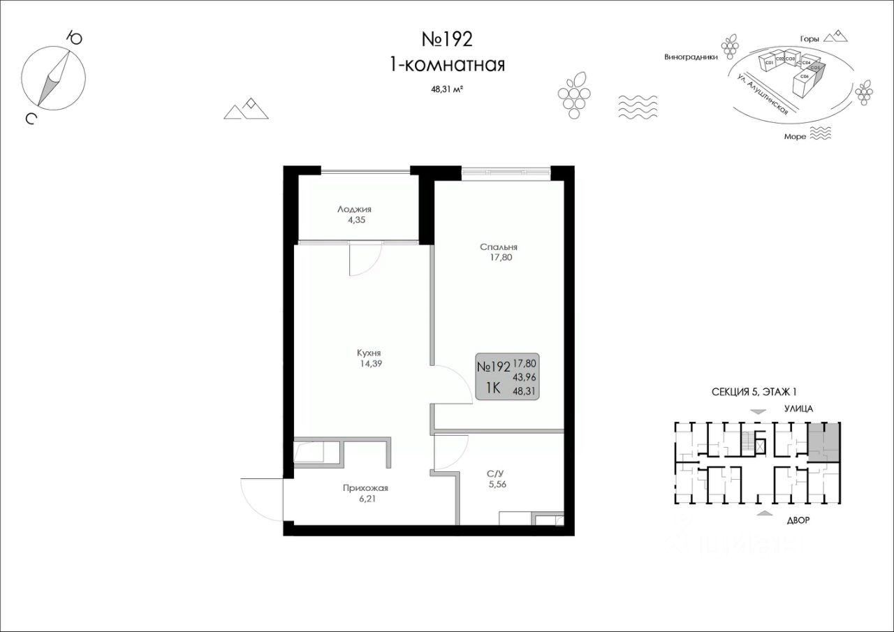 Продаётся 1-комнатная квартира в строящемся доме (Строение 1), срок сдачи: I-кв. 2027, общей площадью 48.31 кв.м., на 1 этаже.