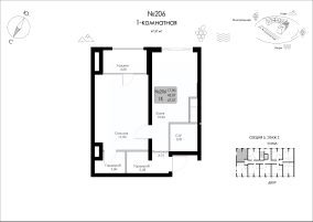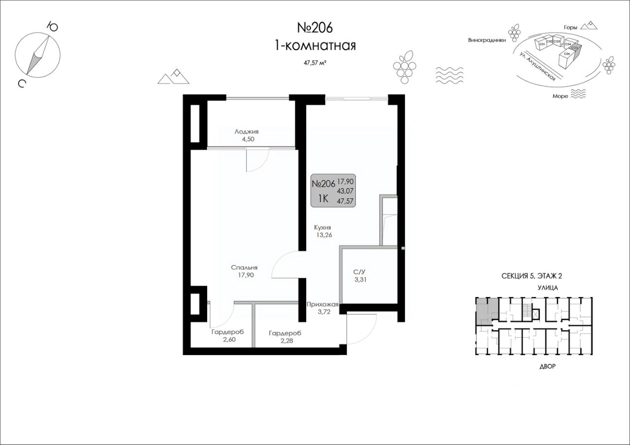 Продаётся 1-комнатная квартира в строящемся доме (Строение 1), срок сдачи: I-кв. 2027, общей площадью 47.57 кв.м., на 2 этаже.