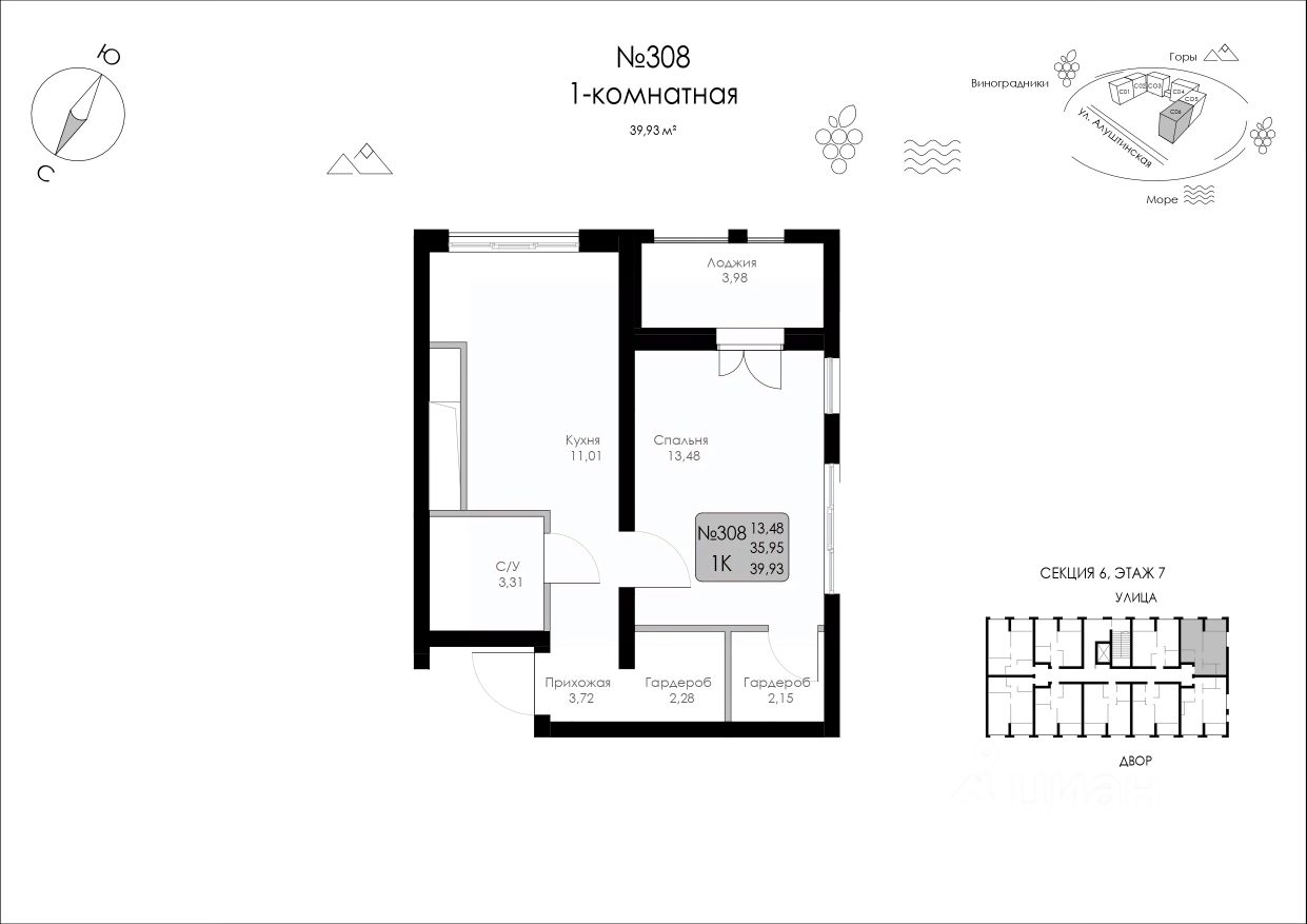 Продаётся 1-комнатная квартира в строящемся доме (Строение 1), срок сдачи: I-кв. 2027, общей площадью 39.93 кв.м., на 7 этаже.