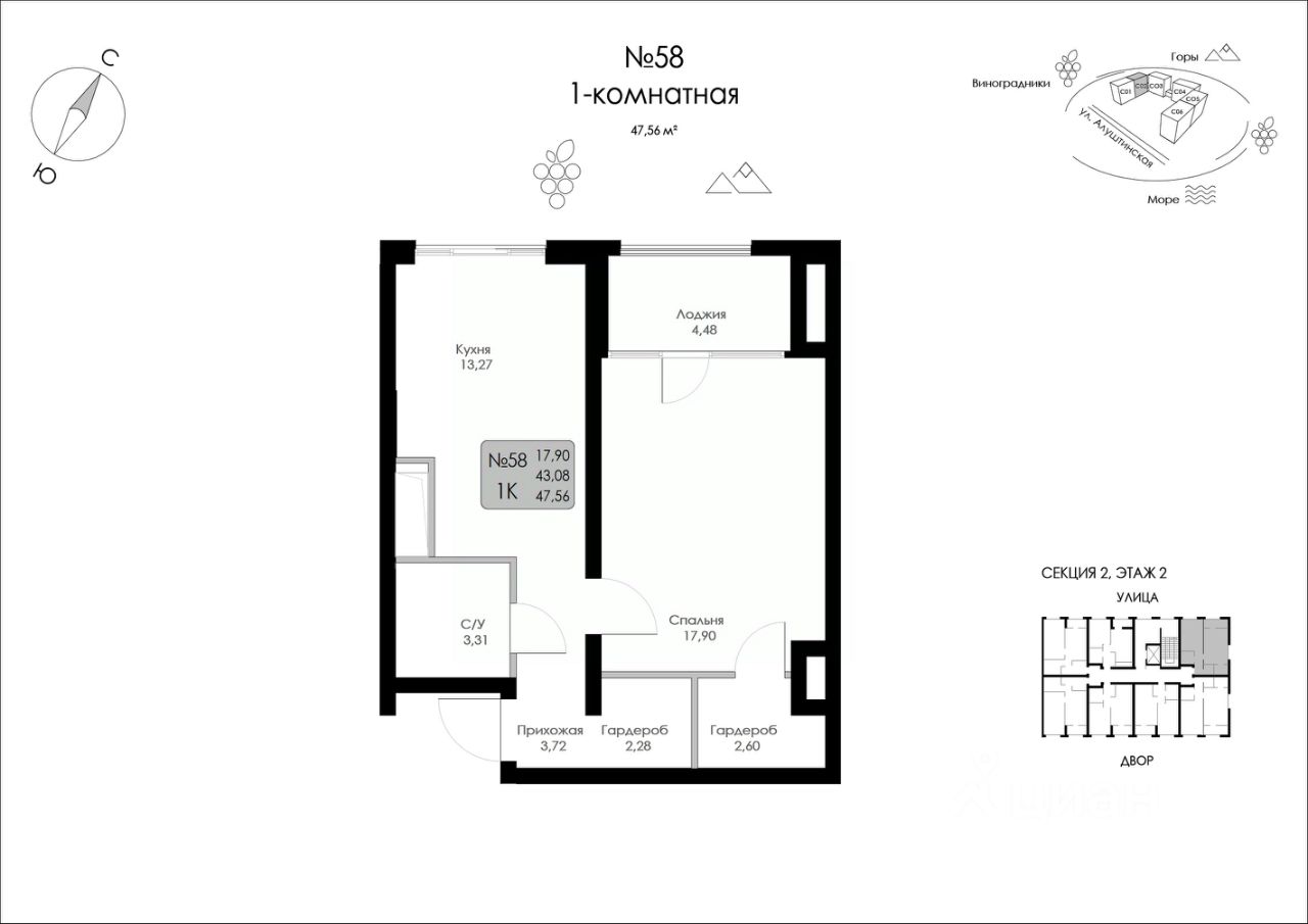 Продаётся 1-комнатная квартира в строящемся доме (Строение 1), срок сдачи: I-кв. 2027, общей площадью 47.56 кв.м., на 2 этаже.