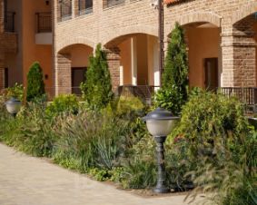 - На закрытой территории комплекса предусмотрено функциональное ландшафтное зонирование: оборудованы прогулочные и рекреационные зоны с фонтаном, рестораном и кафе, спа-зона, магазин, 2 подогреваемых бассейна и большая детская площадка.