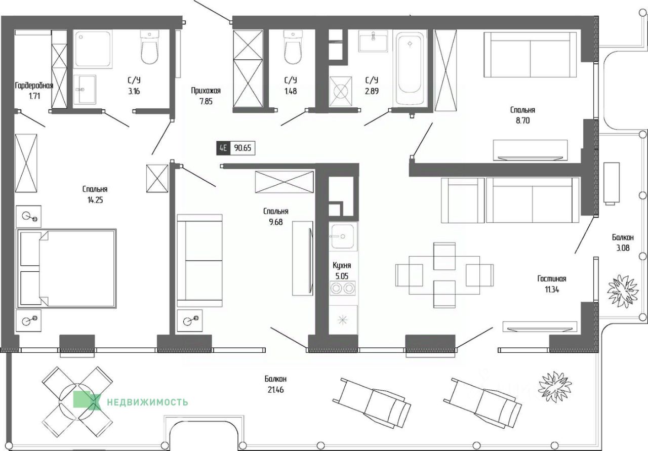 Общая площадь90,65 м²