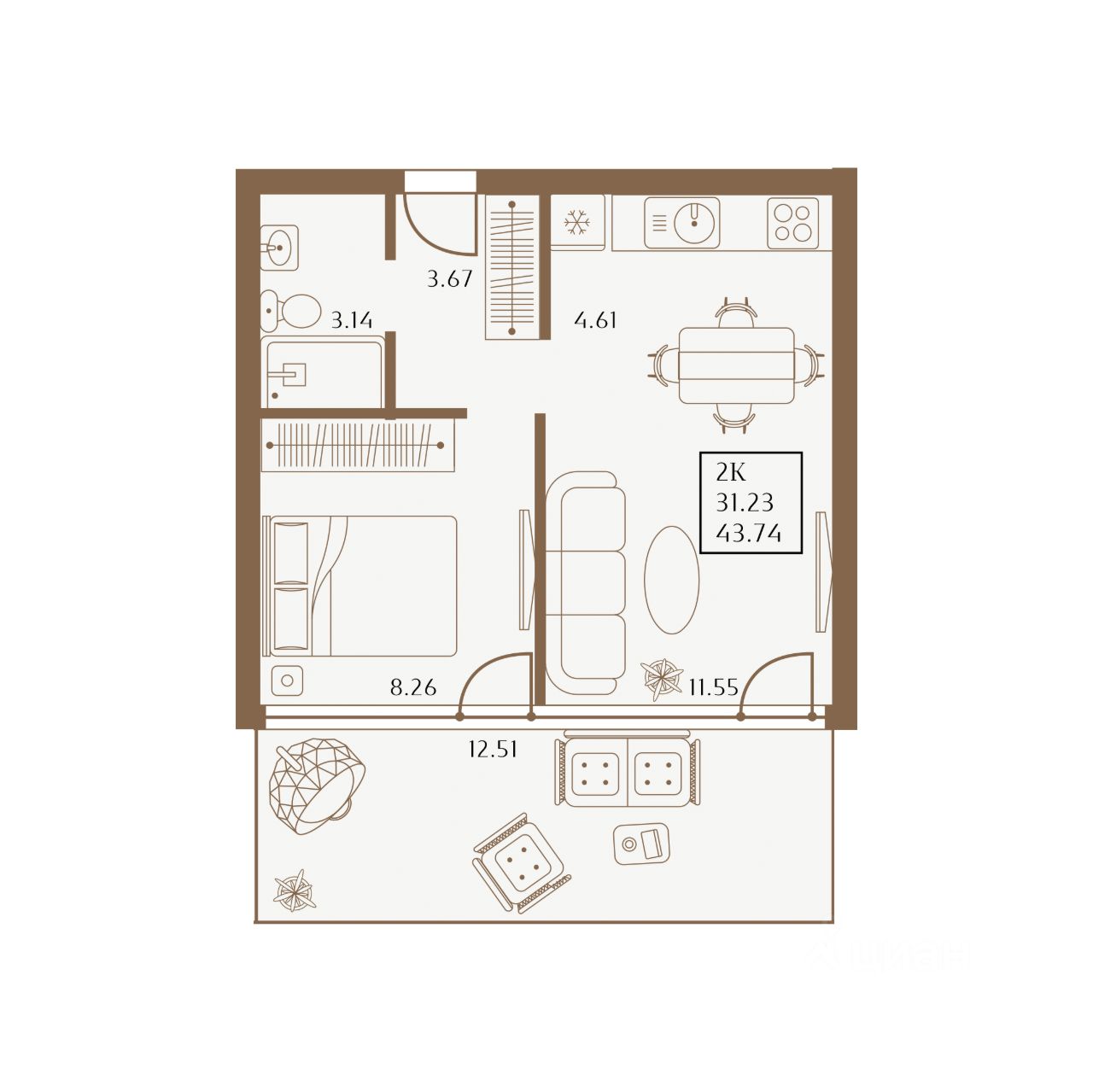 Общая площадь43,74 м²
