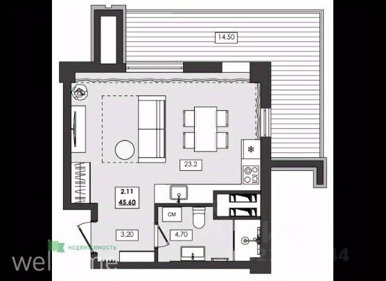 Общая площадь45,6 м²