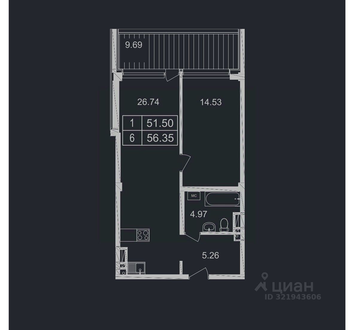 Общая площадь56,35 м²