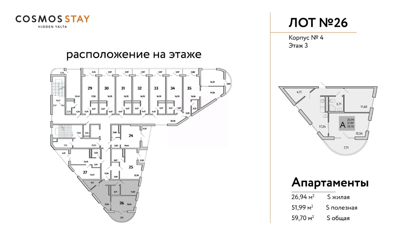 Квадратура апартаментов: от 25м2 до 80,4 м2.