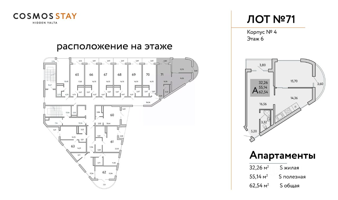 Квадратура апартаментов: от 25м2 до 80,4 м2.