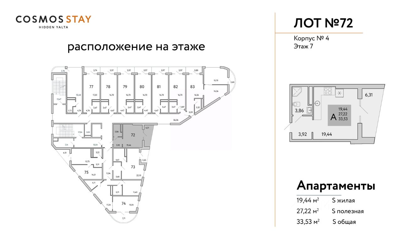 Квадратура апартаментов: от 25м2 до 80,4 м2.