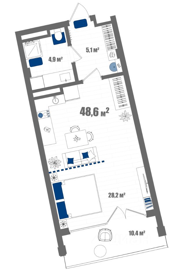 Продаются 1-комнатные апартаменты в сданном доме (корпус А), срок сдачи: III-кв. 2024, общей площадью 48.6 кв.м., на 4 этаже.