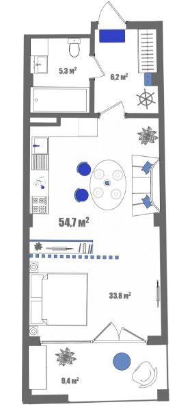 Продаются 1-комнатные апартаменты в сданном доме (корпус А), срок сдачи: III-кв. 2024, общей площадью 54.7 кв.м., на 5 этаже.