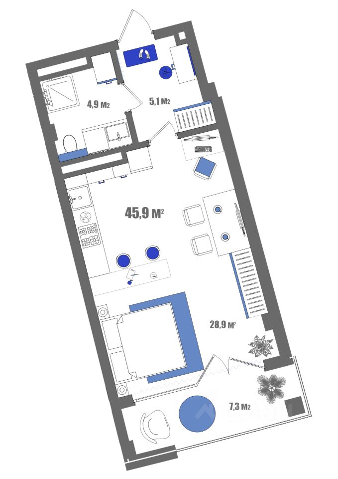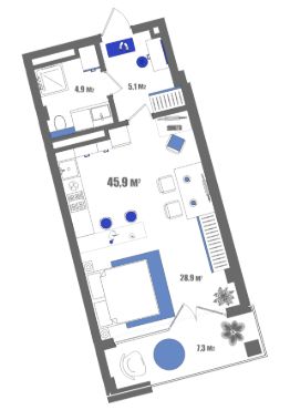Продаются 1-комнатные апартаменты в сданном доме (корпус А), срок сдачи: III-кв. 2024, общей площадью 45.9 кв.м., на 7 этаже.