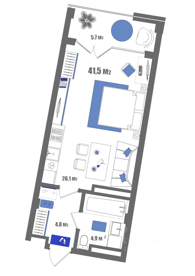 Продаются 1-комнатные апартаменты в сданном доме (корпус А), срок сдачи: III-кв. 2024, общей площадью 41.5 кв.м., на 8 этаже.