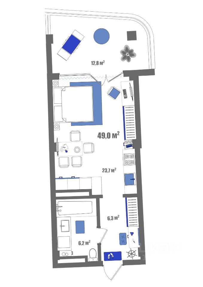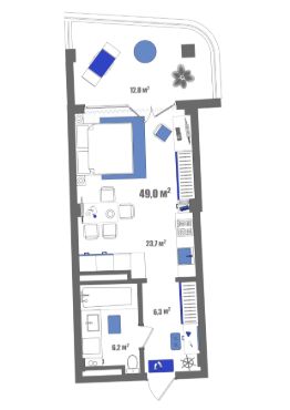 Продаются 1-комнатные апартаменты в сданном доме (корпус А), срок сдачи: III-кв. 2024, общей площадью 49 кв.м., на 8 этаже.