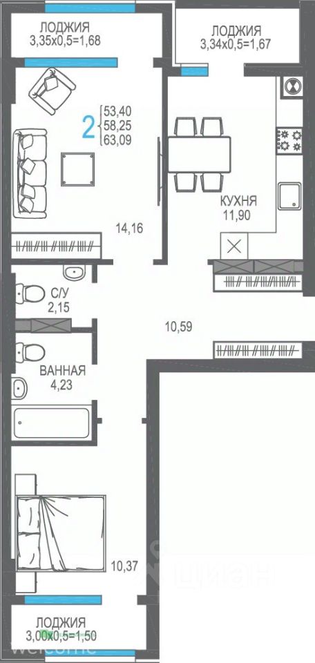 Общая площадь58,25 м²