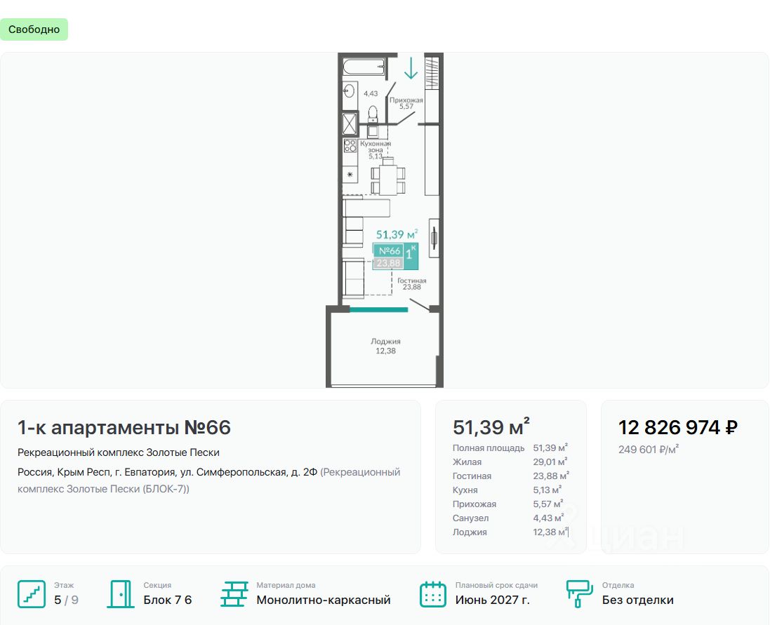 Работаем с любовью Без комиссии для покупателя) Рассрочка Золотые пески Блок 7 ПВ - 30% , остаток делится на равные ежемесячные платежи до 1.03.2027 года. Вид из окон Море Комплекс апартаментов "Золотые пески" в г. Евпатория — семейный комплекс апартаментов на берегу моря с собственной инфраструктурой, в новом современном районе курортного города. Панорамный вид на море из окон апартаментов, шум прибоя, мягкий климат и масса развлечений обеспечат роскошный отдых на крымском побережье. БЛАГОУСТРОЙСТВО и ИНФРАСТРУКТУРА Богатое озеленение: деревья, кустарники, газоны, фонтаны и современные малые архитектурные формы. Наземная парковка на 150 мест по периметру комплекса. На территории комплекса создана полная внутренняя инфраструктура: кафе, пляжные бары, оборудованный пляж, продуктовые магазины, кондитерская, банный комплекс, зоны водных аттракционов и много другое создает комфортную среду для отдыха и восстановления. Жилой комплекс "Золотые пески" в Евпатории, Крым, предлагает уникальные квартиры, которые обладают потрясающим панорамным видом на море. Расположенный в непосредственной близости от пляжа, данный комплекс обеспечивает комфортное проживание, отдых и возможность заработка. Квартиры в "Золотых песках" предлагаются с отделкой под ключ, что позволяет новым владельцам сразу же заселиться и наслаждаться прекрасными видами на море. Кроме того, комплекс предоставляет услуги по управлению, что обеспечивает надежность и безопасность для владельцев квартир. Жилой комплекс "Золотые пески" идеально подходит для тех, кто хочет насладиться прекрасным видом на море, комфортом проживания и возможностью заработка. Благодаря своему расположению в шаговой доступности от пляжа, данный комплекс предлагает уникальную возможность наслаждаться морскими прогулками и отдыхом на пляже. Отличная инфраструктура и возможность аренды квартир делают данный комплекс привлекательным как для собственного проживания, так и для инвестиций. СЕРВИС Комплекс апартаментов обслуживают специалисты собственной управляющей компании. Все Ваши заботы переходят в руки профессионалов. А если Вы планируете сдавать апартаменты в аренду, УК возьмёт на себя все организационные вопросы. ПРЕИМУЩЕСТВА - бирюзовое море в 50 м от дома; - закрытый дом с видеонаблюдением; - вид на розовое озеро и море; - консьерж-сервис; - автономная газовая котельная; - просторные лоджии до 12,8 м²; - собственная управляющая компания; - доверительное управление апартаментами 24/7; Один из преимуществ жилого комплекса - наличие парковки и развитой инфраструктуры. Владельцы квартир могут не беспокоиться о поиске места для своего автомобиля и наслаждаться комфортной парковкой. Кроме того, рядом с комплексом имеется все необходимое для комфортного проживания и отдыха: магазины, рестораны, кафе и другие объекты инфраструктуры. Жилой комплекс "Золотые пески" располагается на черноморском побережье в 100 метрах от моря. Местный климат достаточно мягкий, он идеально подходит для людей любого возраста. Бл