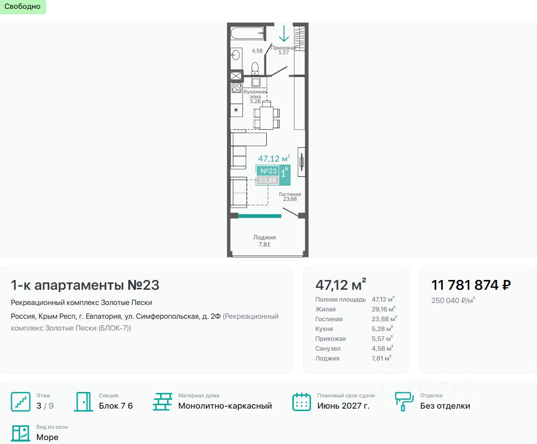 Работаем с любовью Без комиссии для покупателя) Рассрочка Золотые пески Блок 7 ПВ - 30% , остаток делится на равные ежемесячные платежи до 1.03.2027 года. Вид из окон Море Комплекс апартаментов "Золотые пески" в г. Евпатория — семейный комплекс апартаментов на берегу моря с собственной инфраструктурой, в новом современном районе курортного города. Панорамный вид на море из окон апартаментов, шум прибоя, мягкий климат и масса развлечений обеспечат роскошный отдых на крымском побережье. БЛАГОУСТРОЙСТВО и ИНФРАСТРУКТУРА Богатое озеленение: деревья, кустарники, газоны, фонтаны и современные малые архитектурные формы. Наземная парковка на 150 мест по периметру комплекса. На территории комплекса создана полная внутренняя инфраструктура: кафе, пляжные бары, оборудованный пляж, продуктовые магазины, кондитерская, банный комплекс, зоны водных аттракционов и много другое создает комфортную среду для отдыха и восстановления. Жилой комплекс "Золотые пески" в Евпатории, Крым, предлагает уникальные квартиры, которые обладают потрясающим панорамным видом на море. Расположенный в непосредственной близости от пляжа, данный комплекс обеспечивает комфортное проживание, отдых и возможность заработка. Квартиры в "Золотых песках" предлагаются с отделкой под ключ, что позволяет новым владельцам сразу же заселиться и наслаждаться прекрасными видами на море. Кроме того, комплекс предоставляет услуги по управлению, что обеспечивает надежность и безопасность для владельцев квартир. Жилой комплекс "Золотые пески" идеально подходит для тех, кто хочет насладиться прекрасным видом на море, комфортом проживания и возможностью заработка. Благодаря своему расположению в шаговой доступности от пляжа, данный комплекс предлагает уникальную возможность наслаждаться морскими прогулками и отдыхом на пляже. Отличная инфраструктура и возможность аренды квартир делают данный комплекс привлекательным как для собственного проживания, так и для инвестиций. СЕРВИС Комплекс апартаментов обслуживают специалисты собственной управляющей компании. Все Ваши заботы переходят в руки профессионалов. А если Вы планируете сдавать апартаменты в аренду, УК возьмёт на себя все организационные вопросы. ПРЕИМУЩЕСТВА - бирюзовое море в 50 м от дома; - закрытый дом с видеонаблюдением; - вид на розовое озеро и море; - консьерж-сервис; - автономная газовая котельная; - просторные лоджии до 12,8 м²; - собственная управляющая компания; - доверительное управление апартаментами 24/7; Один из преимуществ жилого комплекса - наличие парковки и развитой инфраструктуры. Владельцы квартир могут не беспокоиться о поиске места для своего автомобиля и наслаждаться комфортной парковкой. Кроме того, рядом с комплексом имеется все необходимое для комфортного проживания и отдыха: магазины, рестораны, кафе и другие объекты инфраструктуры. Жилой комплекс "Золотые пески" располагается на черноморском побережье в 100 метрах от моря. Местный климат достаточно мягкий, он идеально подходит для людей любого возраста. Бл