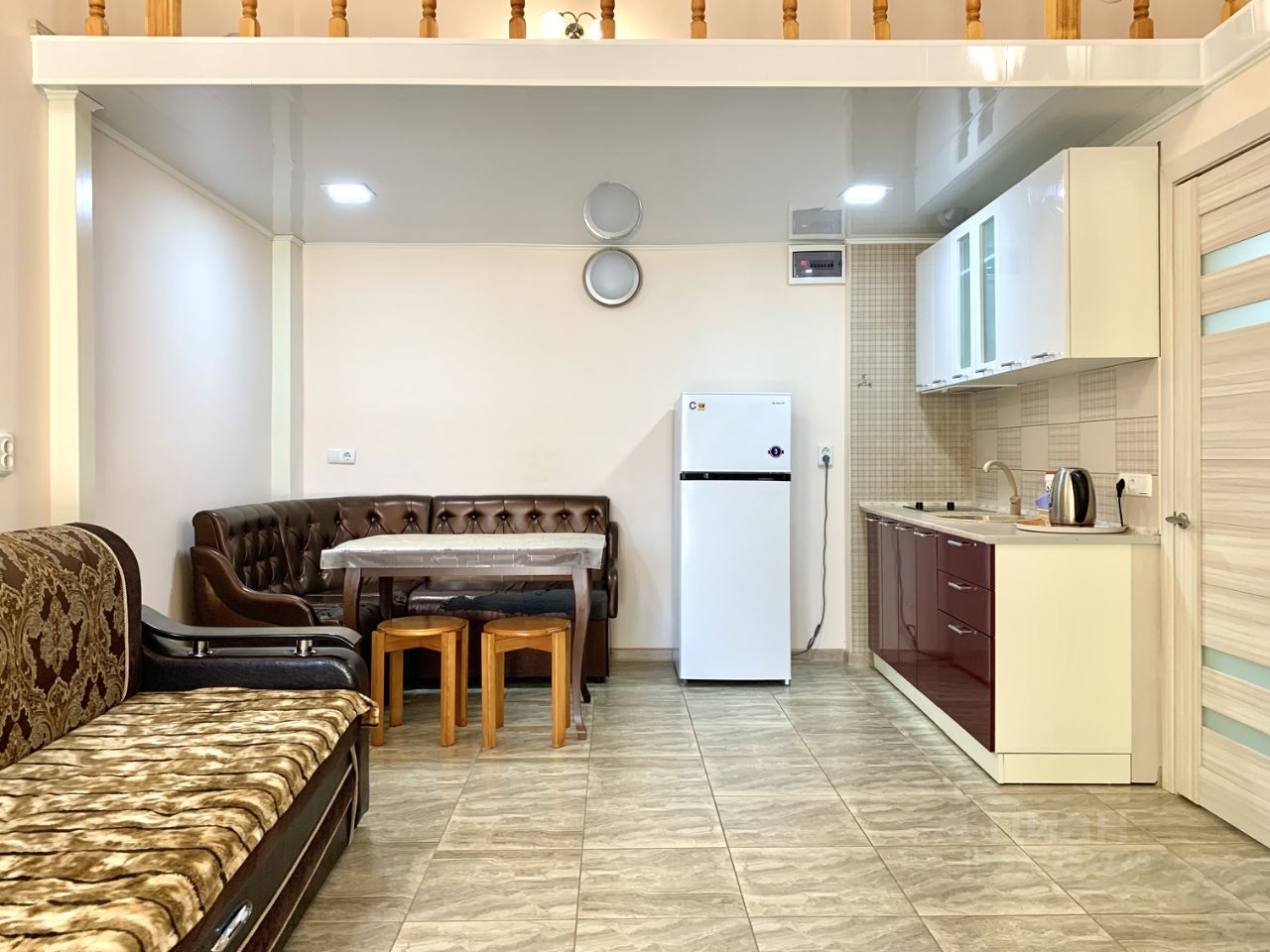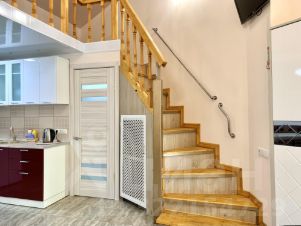 Общая площадь помещения 26.6 кв. м., расположение на 1-ом этаже 9-этажного здания комплекса, высота потолка - 4 м. Дополнительно в помещении предусмотрена антресоль для спальной зоны.