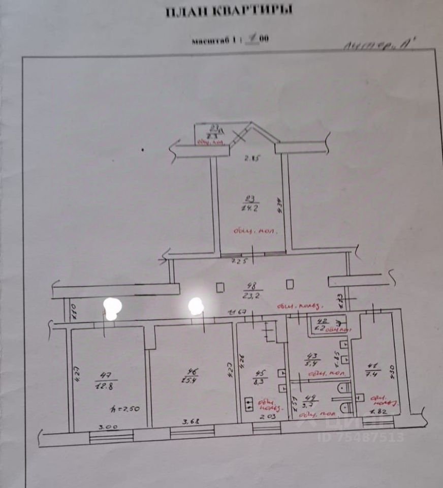 Площадь комнат составляет 15,4 кв.м, 12,8 кв.м, плюс приватизированный коридор 11 кв.м. Общая площадь — 48,2 квадратных метра, жилая площадь — 28,2 квадратных метра.