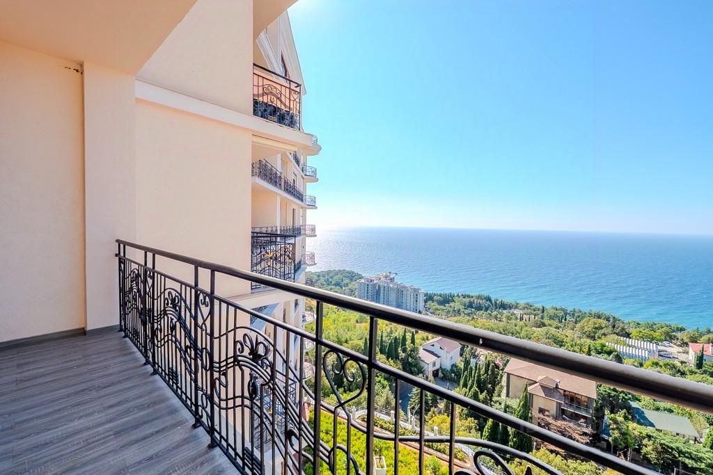 Квартира общей площадью 102,4 кв.м, расположена на 7 этаже 10 этажного корпуса. Главное достоинство панорамное остекление. Окна выходят на 2 стороны света и с обеих сторон имеется свой большой видовой балкон. С Юга вид открывается на море, горный хребет и ялтинскую бухту, с Севера вид открывается на заповедную зону и Никитский ботанический сад. Высокие потолки 3,40 м дарят много света и воздуха.