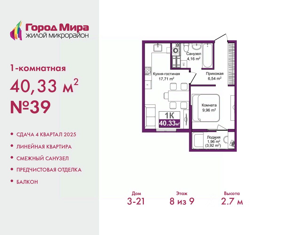 Однокомнатная квартира от застройщика с предчистовой отделкой в ЖМ "Город Мира" на 8 этаже. Общая площадь: 40.33 кв.м., жилая: 9.96 кв.м., площадь просторной кухни-столовой: 17.71 кв.м. Все окна выходят на одну сторону. В квартире один балкон, один совмещенный санузел. Высота потолков 2.7 м.