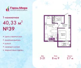Просторная однокомнатная квартира с предчистовой отделкой в ЖМ "Город Мира" на 8 этаже. Общая площадь: 40.33 кв.м., жилая: 9.96 кв.м., площадь просторной кухни-столовой: 17.71 кв.м. Все окна выходят на одну сторону. В квартире один балкон, один совмещенный санузел. Высота потолков 2.7 м.