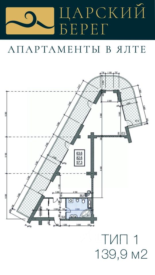 Панорамный вид (около 270 градусов) на море и отличный вид на горно-лесной заповедник будут радовать Вас постоянно. Комплекс "Царский берег" - это апартаменты различной площади: от 63 до 140 кв.м. Высота потолков - 3 метра. На Ваш выбор мы представляем 91 апартамент (со 2 по 14 этажи). На каждом этаже запроектировано всего 7 типовых планировок, которые смогут удовлетворить самый взыскательный вкус. Свободная планировка этих апартаментов позволит Вам организовать пространство в любом стиле. Можно спланировать будуар, итальянскую гостиную, японскую спальню и даже тренажерный зал. Открытые террасы, застекленные лоджии, панорамные окна, остекленные от пола до потолка, - всё это даёт отличную возможность жителям комплекса наслаждаться потрясающими панорамами крымских гор и Чёрного моря даже с нижних этажей дома.