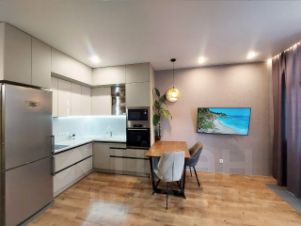 Апартамент полностью укомплектован необходимой для проживания мебелью и техникой. Мебель выполнена из качественных современных материалов, все дверцы оборудованы доводчиками.