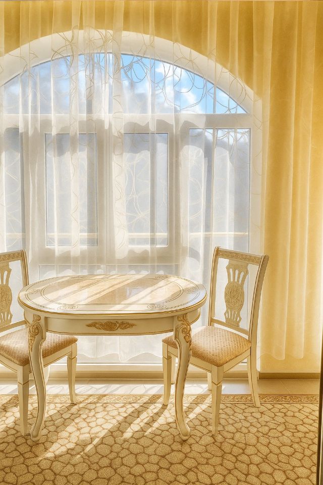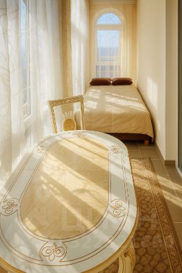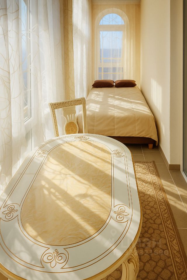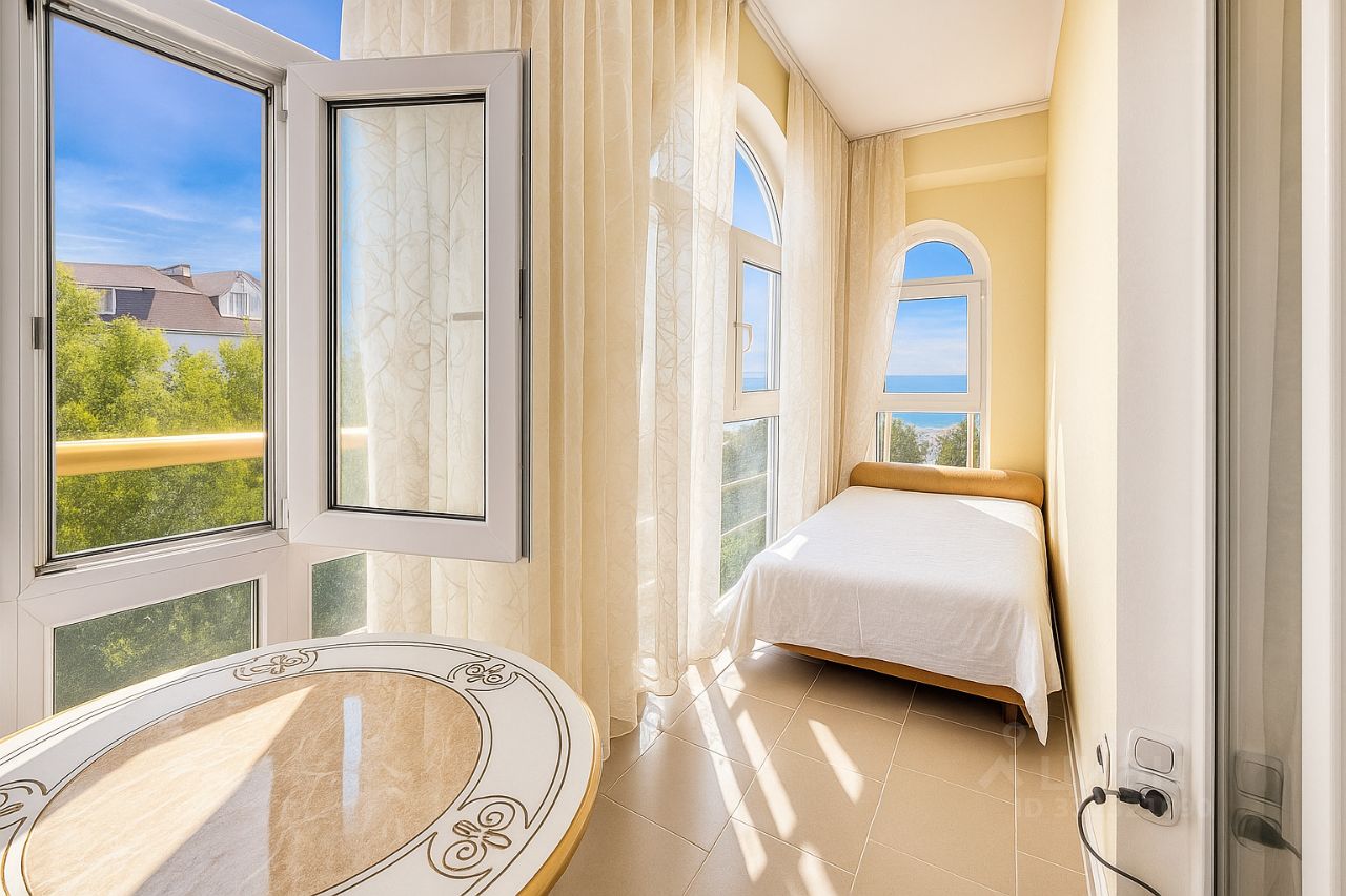 Просторная кухня-гостиная с выходом на застекленный балкон открывает захватывающий вид на сверкающие воды Черного моря — настоящее наслаждение курортной жизни!