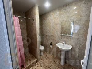 В сан узле плитка, в комнатной и кухонной зоне ламинат, тропический душ, натяжной потолок белый матовый.